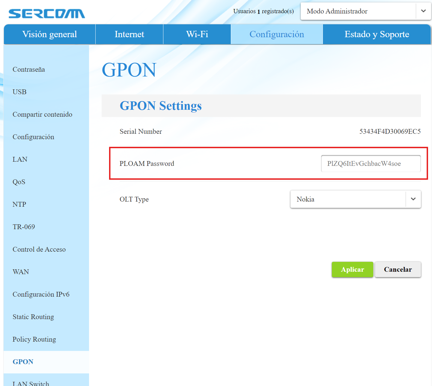 La PLOAM password me sonaba haberla visto en texto plano dentro de la opcion GPON de la sección Configuración en la interfaz de administración del router.